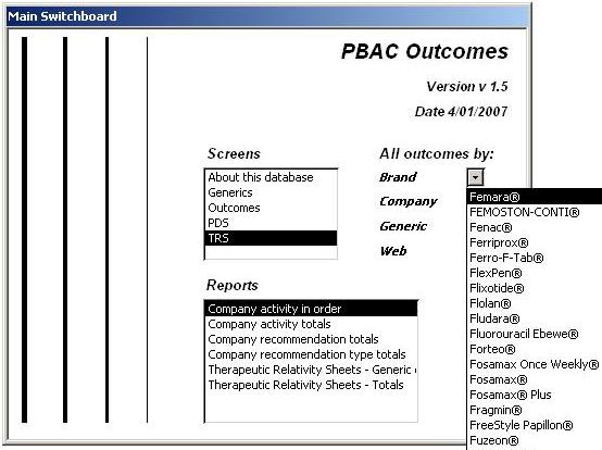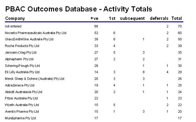 | Home About Us Projects ProductsContact | The PBAC outcomes system is based on PBAC outcomes data which is publish to the 3-4 times each year. The data is presented in simple tables - while the data might be valuable it is very difficult if not impossible to sort or query, for example:-