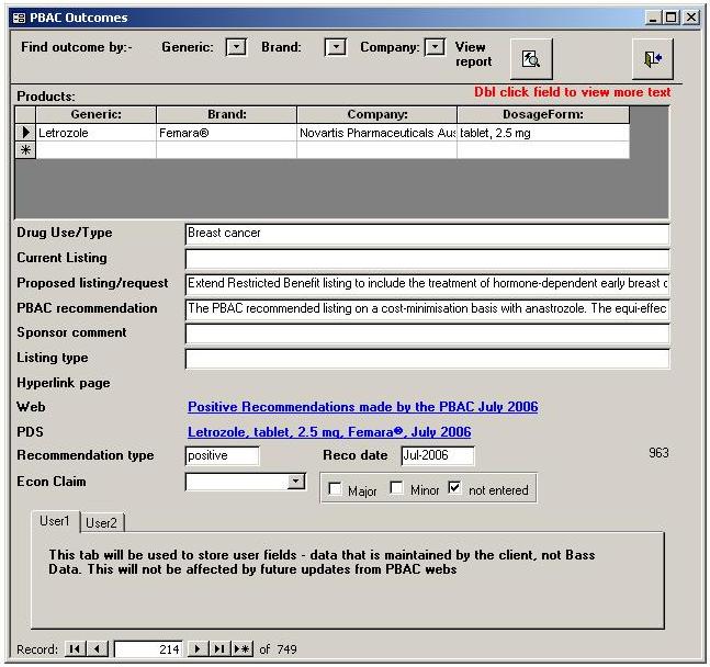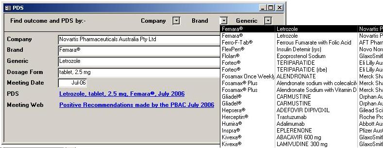 The PBAC outcomes database allows users to perform such queries, and more. Outcome data is downloaded and converted shortly after it is published. Outcomes can be selected by Brand (as shown above), Company or Generic. Detailed outcome data including links to the PBAC outcomes web page and any Public Summary Document are shown on the Outcomes Screeen (see below) The outcomes screen has the ability for clients to design and enter thier own data, on the planned future User Tabs at the bottom of the screen It is possible to search for PDS records, as shown below. Once more PDS records can be selected by Company, Brand of Generic.
