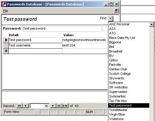 | Home About Us Projects ProductsContact | Have you ever gone to a website only to be asked for your username and password, then had to scrabble round file and other unsecure bits of paper for these details? Me too - which is why I wrote a passwords database. This is a very simple database that store any kinds of detail. It is searchable via the drop down list. Most important of all, it is password protected - it needs to be!! This simple database is available free of charge - simple contact Bass Data for a copy. |